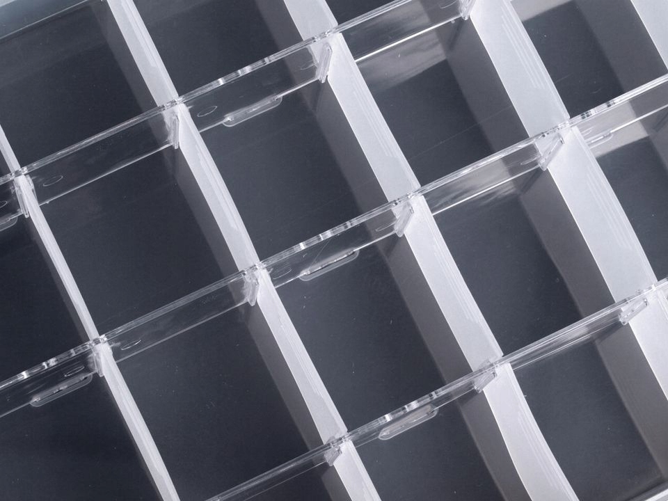 ✅ Pojemnik posiada 28 przegródek o wymiarach: 42 x 51 mm i głębokości: 42 mm. Przegródki można regulować przy użyciu wyjmowanych przekładek (3 szt. długie i 24 szt. krótkie). Usuwając wszystkie przekładki można utworzyć przegrodę o wymiarach: 21 x 34 cm.