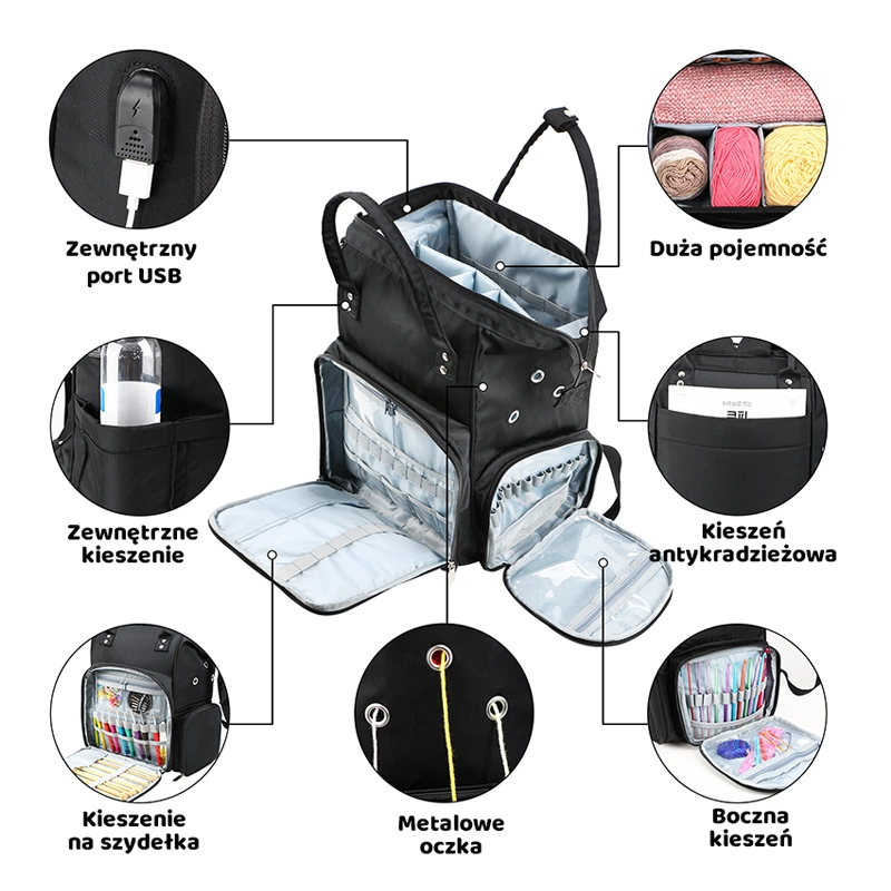 Plecak dziewiarski na włóczki, organizer z portem USB
