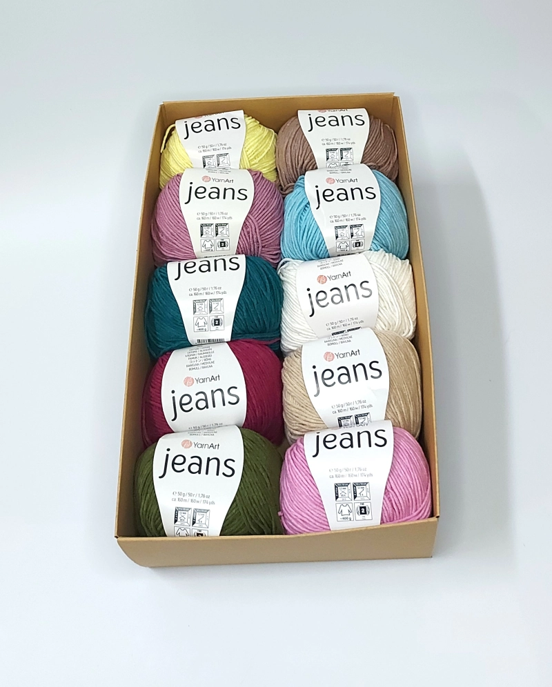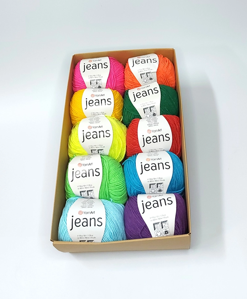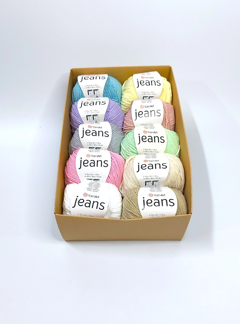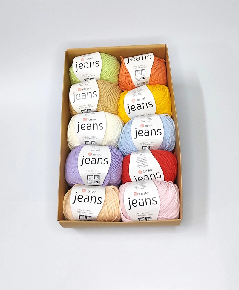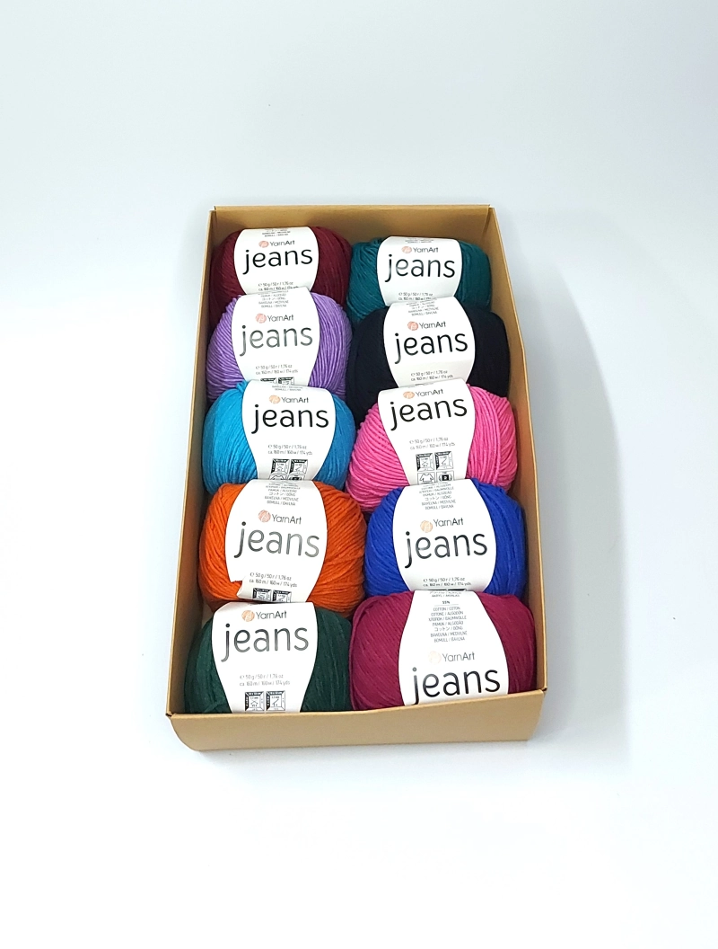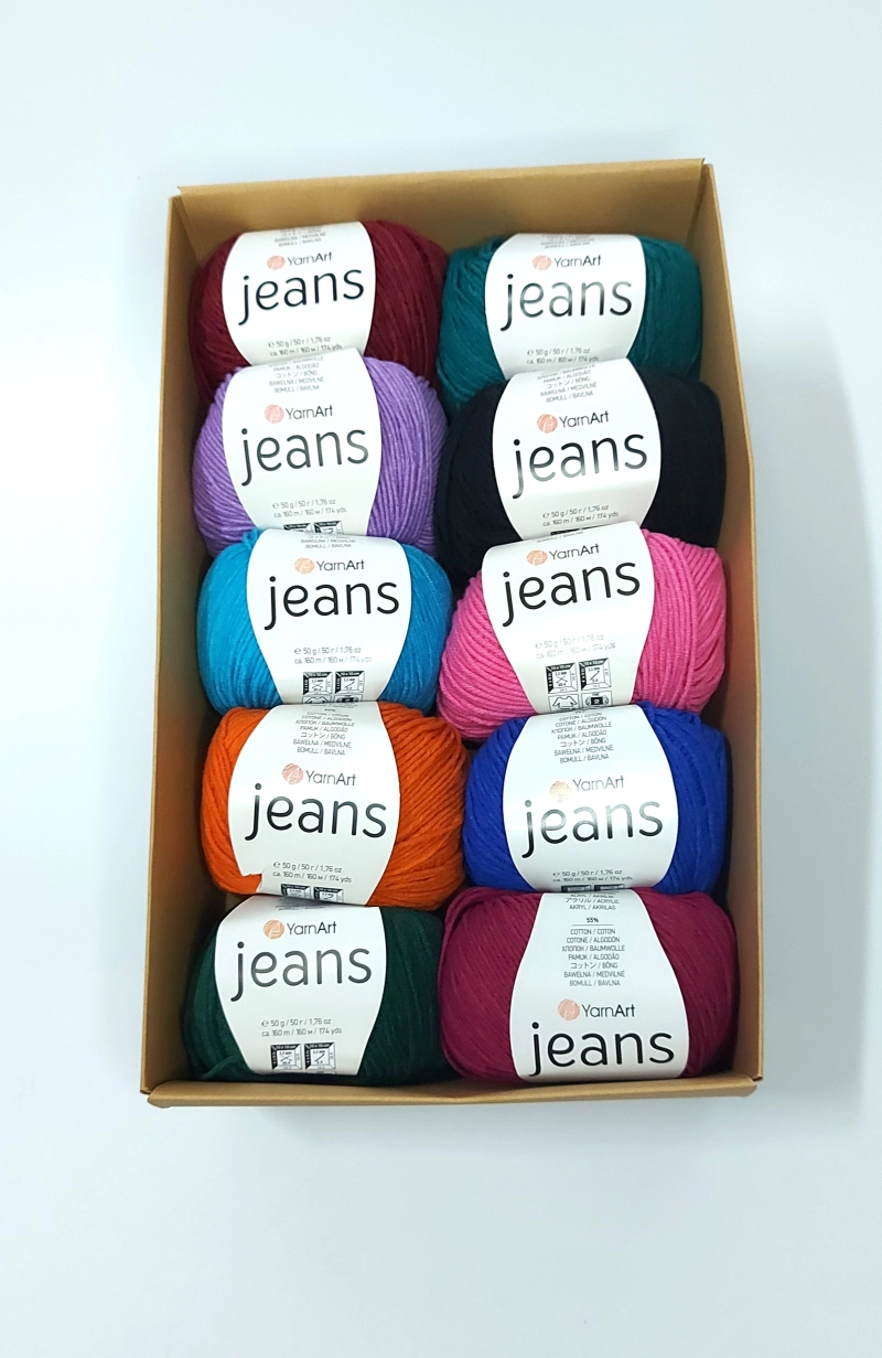 - zestaw 10 motków włóczki YarnArt Jeans w różnych kolorach - każdy zestaw zawiera inne, losowe kolory,