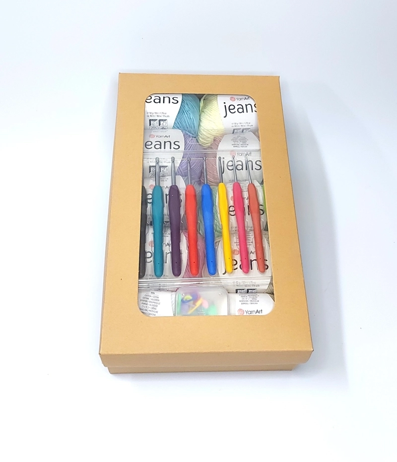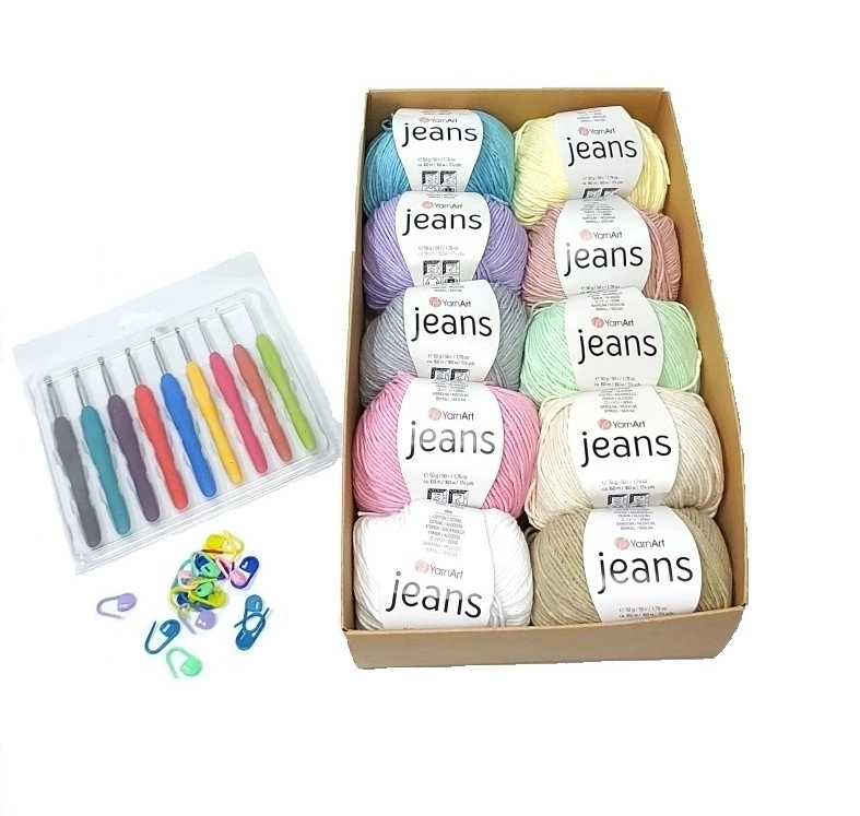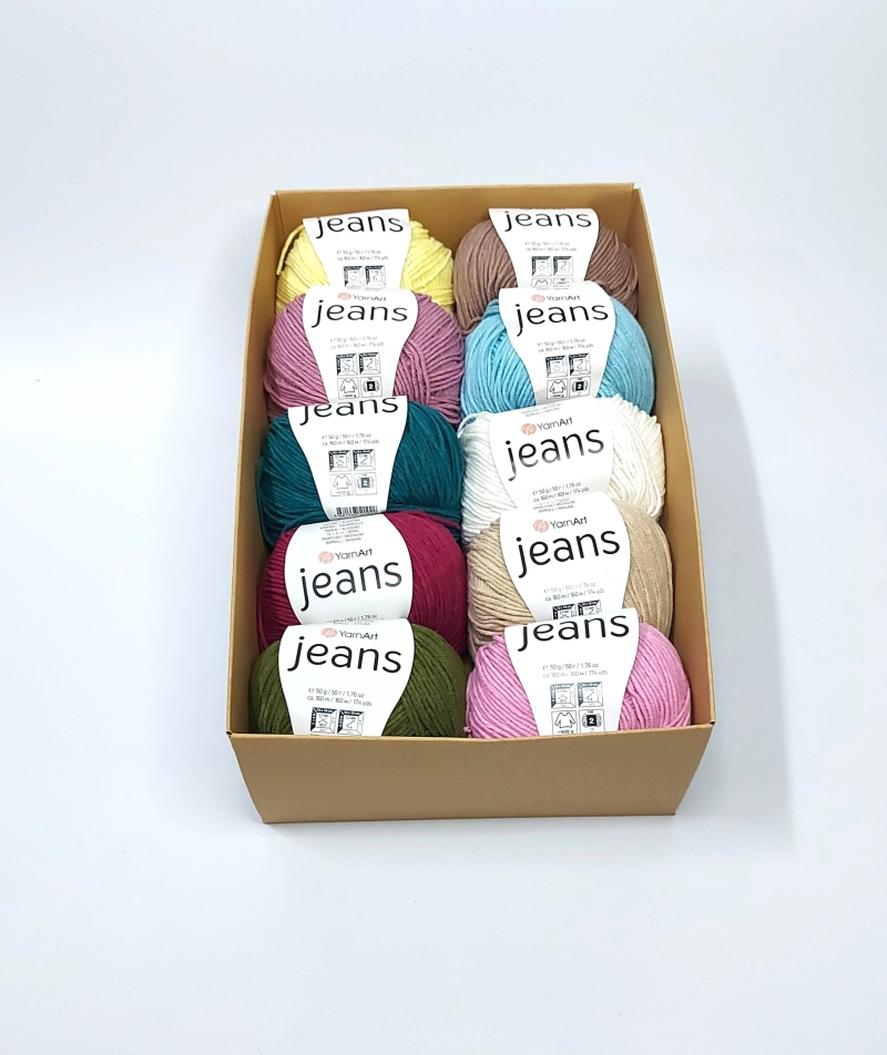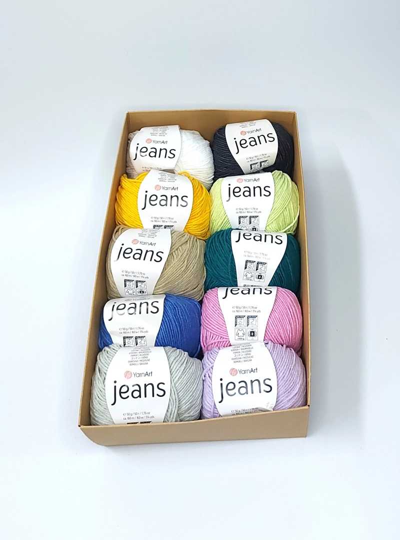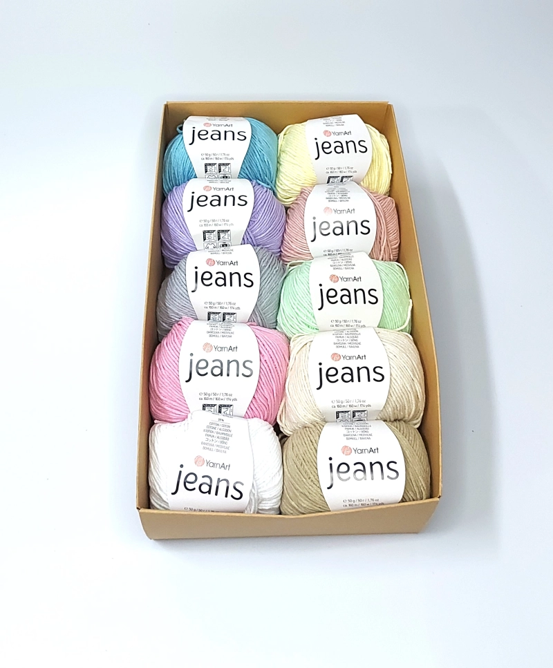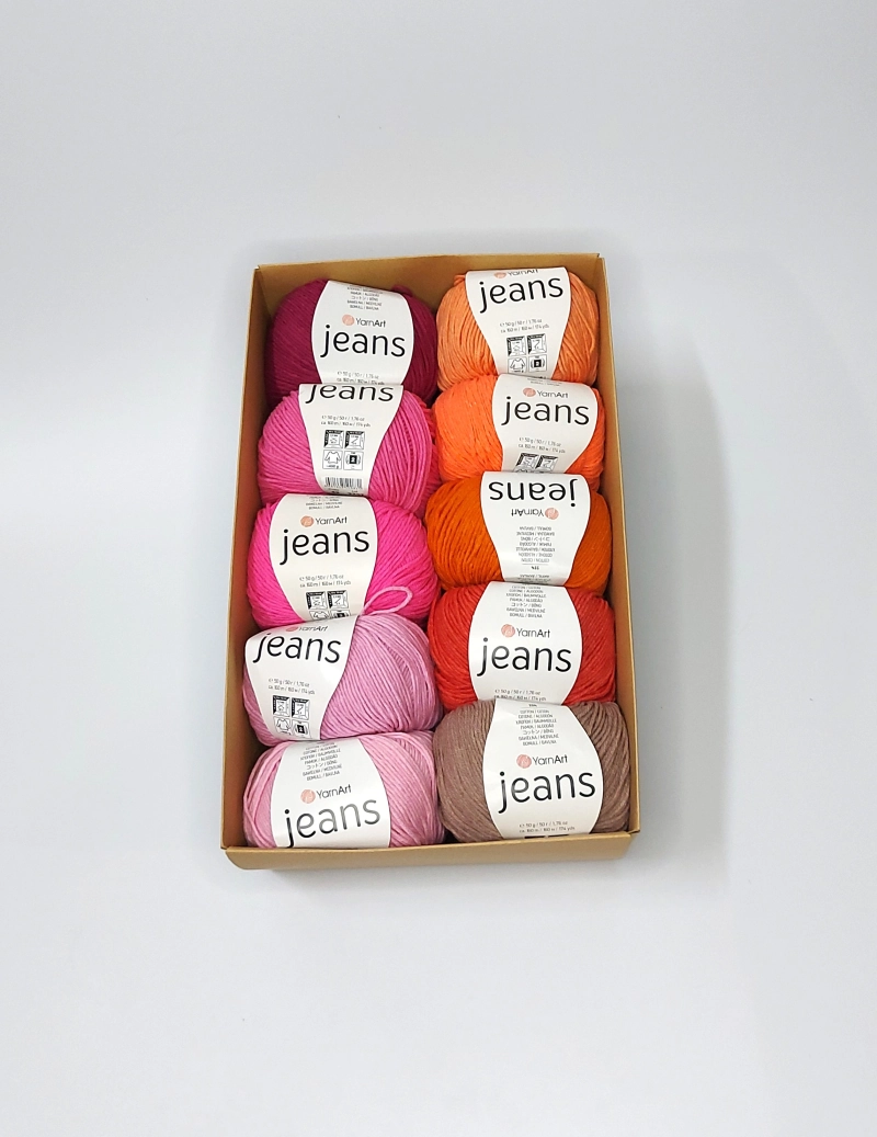 - zestaw 10 motków włóczki YarnArt Jeans w różnych kolorach - każdy zestaw zawiera inne, losowe kolory,